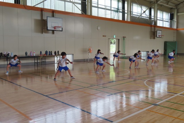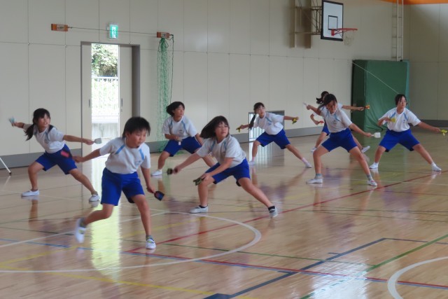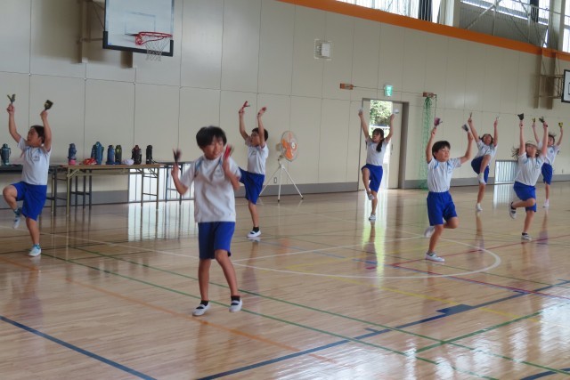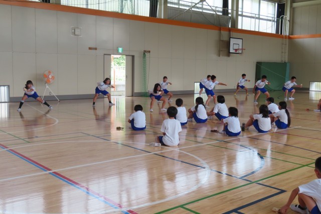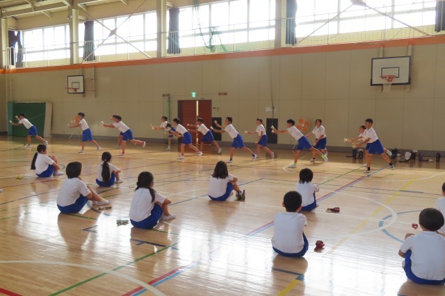 「雷光」各学年ごとの見せ合いをしていました。他の学年のいいところを見付けたり、自分も一緒に演技していると思って動きの確認をしていたりと見ている児童は、ただ見ているだけではなく、それぞれ目的をもって真剣に見ていました。特にお互いにこうやって見せ合うことで、さらに「よしやるぞ!」と気持ちが引き締まったことと思います。こうやって切磋琢磨しあいながら高めあっていける関係もできあがっています。