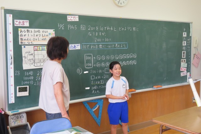 「10000より大きい数」の学習中。今日は、200を10でわった数について考えていました。まずは自分の考えを発表しあいます。図をかいて考えたり、10倍すると20になる数として考えたり、1年生のときにやった「さくらんぼ算」の考え方を取り入れて考えたり・・・。中には、そろばん的に考えると・・・、という児童もいました。みんな同じではない考え方を共有するとさらに学びが楽しくなるものです。そんなやり取りをしていたら、今日の「まとめ」につながりそうな気付きの声があがりました。