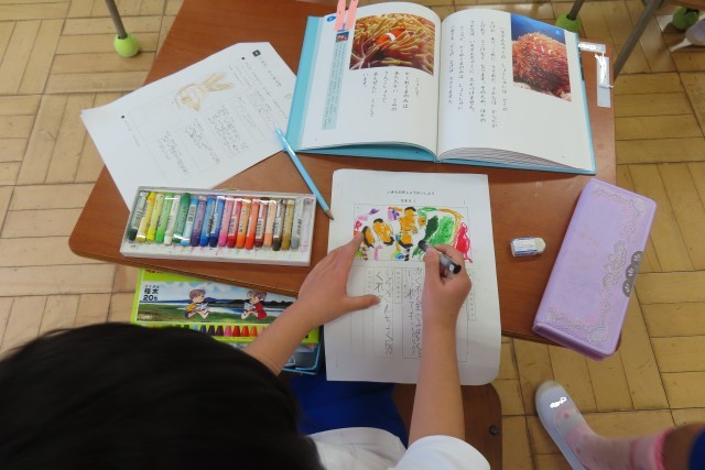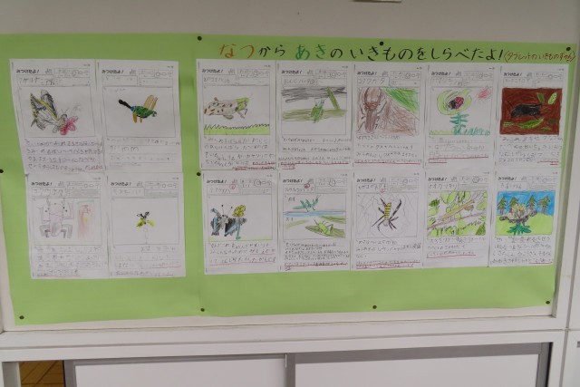 教室に入ると先生が1年生の成長に大感激です。「うみの かくれんぼ」の学習のゴールは、自分で「ほかの いきものの かくれんぼを しらべてみたいな」と思った生き物について調べ、みんなに紹介します。自分の調べたワークシートをうつして、みんなにしっかり発表していました。こんなことができるようになって!1年生の成長に驚いています。なお、生活科でも秋の生き物について調べてまとめました。廊下に掲示してあるのを見ると、ここからも1年生の成長を感じます。