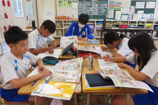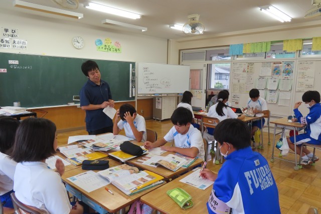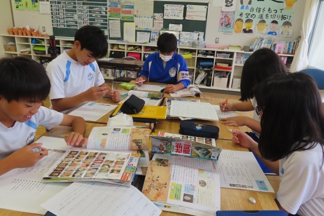 「武士の世の中へ」の総復習をしています。6年生にとっては、楽しみな修学旅行の充実につながる「ここでは」の学習内容なので、かなり!真剣に取り組んでいました。机の上に教科書、ノート、資料集・・・。(まずは自分の力で課題に取り組みますが)参考にします。そして心強いのは中学生です。どうしてもこまったときに聞いてみます。また、自分の考えたことがあっているかどうか?中学生に質問もできます。さすが!の中学生はスラスラと進めていました。6年生にとって、よいお手本です。