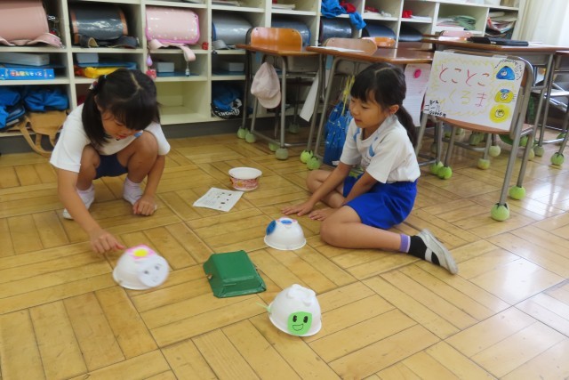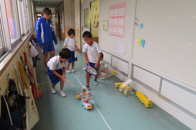 ゴムでっぽう、ぴょんこっぷ ぱっちんじゃんぷ、ころころころん、よっとかー、びゅんびゅん・ぱたぱたかー・とことこくるま などなど。どれも買った物はありません。みんな自分の家にあるもの、使った物を再利用して考えてつくったおもちゃです。本当にみんな楽しく遊んでいました。
