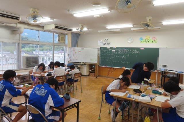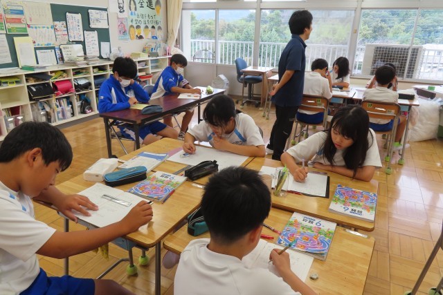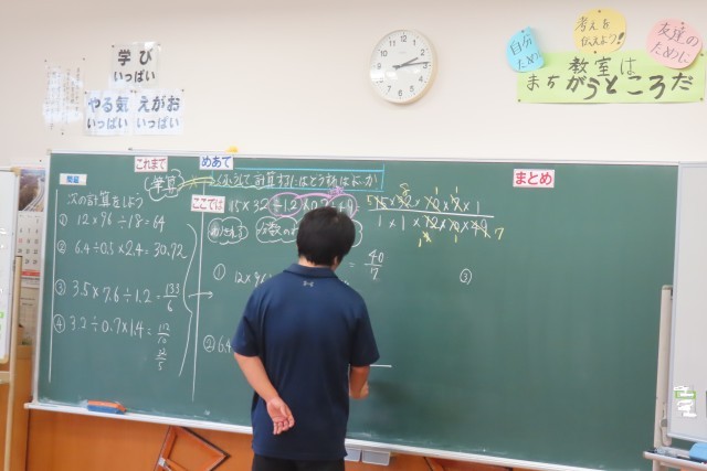 「分数のわり算」の学習中。今日は、小数と分数の混じった計算の仕方を考えました。先生から出されたいくつかの問題について、児童は一生懸命筆算で計算して考えました。「これまで」そう学習してきたからです。でも先生は筆算を使わずに答えをだしました。6年生は驚いていましたが、6年生がランダムに言う数字を使ってつくった式にも、先生は簡単に答えることができました。またまた6年生は驚きました。先生は「みんなにもできるよ!工夫すれば・・・」というと、今日の学習への「やる気いっぱい」に火がつきました。(中学生も!?)
