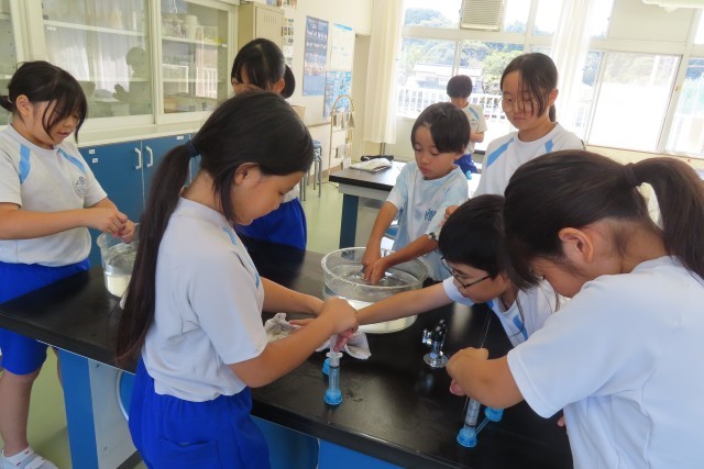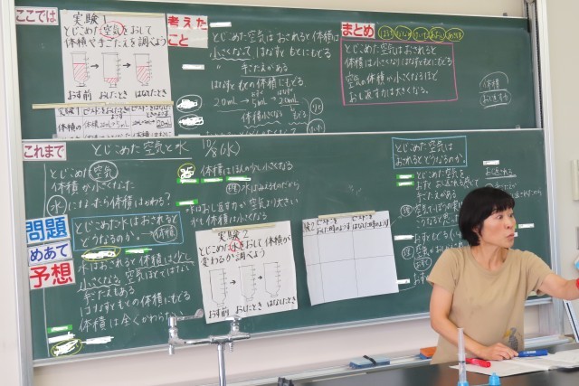 「とじこめた空気と水」今日の問いは「とじこめた水はおされるとどうなるか」予想して、実験して、考察して。注射器のような容器に水を入れてピストンで水を押してみたときの手応えや体積をみます。前時の空気での実験結果と比べて考察している児童もいました。実験前の予想通りの結果だった児童は、水遊びでの経験があるからと言っていました。「そうか、思い出した!」気付いた児童もいました。学んだことと自分の経験がつながっていたんだ!と分かったときはとてもうれしいものです。