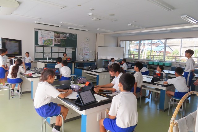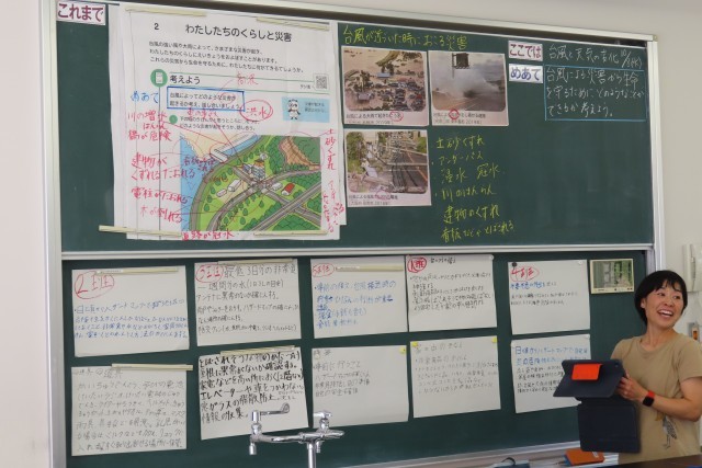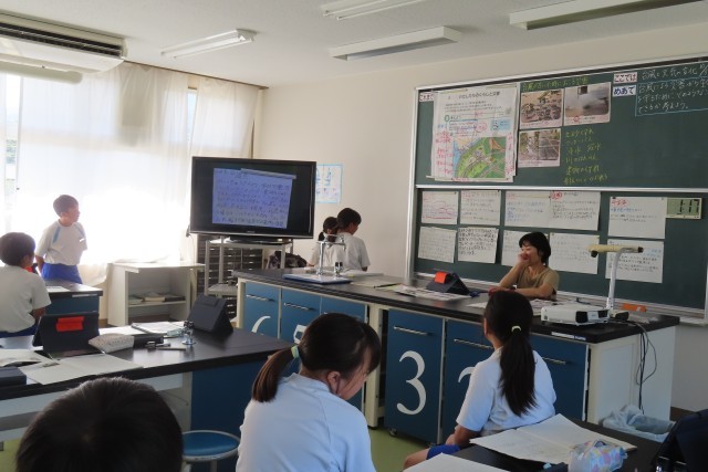 「台風と天気の変化」の学習の総まとめです。「ここでは」学習してきたことと自分たちの生活とをつなげて、じっくり考えます。台風による災害や災害に対する備え等について、調べて、正しいしっかりとした考えをもちます。理科室ではその発表中でした。自分が気付かなかった友達の発表内容をしっかりメモして、さらに考えていました。「ハザードマップか・・・、家族で確認してみよう」「うちには防災グッズそろってたかな?」自分の学びが家族や地域の安全にもつながる大切なものであるなんて、素晴らしいですね。