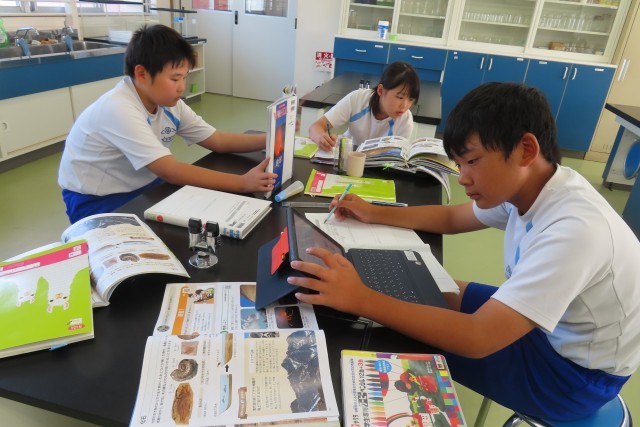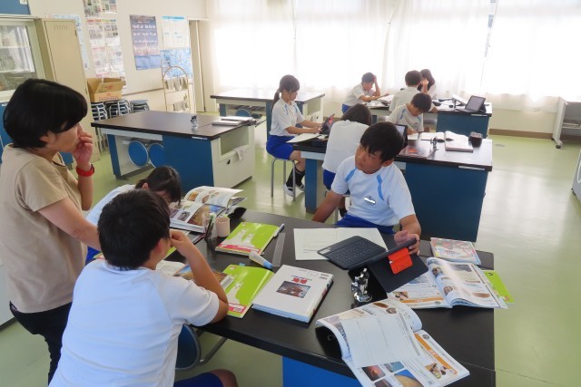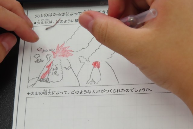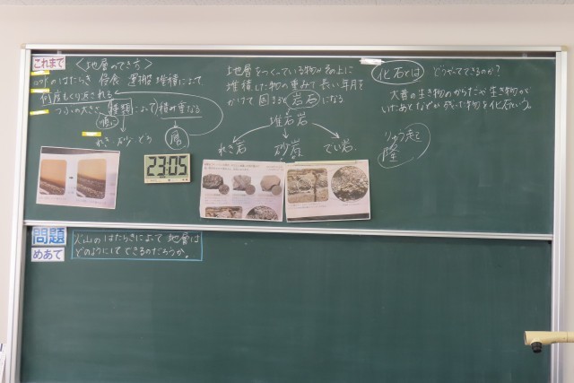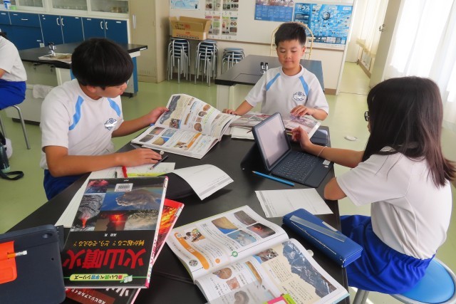 「大地のつくり」の学習中です。今日は、火山の働きによる地層のでき方について、調べ学習をしていました。具体的には、火山灰の積もり方、火山の噴火によってどのような大地がつくられたのかについてです。教科書はもちろんですが、タブレットや図書資料もあります。今ではもう慣れていて便利なタブレットですが、図書資料を参考に調べ学習を進めている場面も多いです。必要な情報は何か?自分にとって何をどう調べるとよいか?これをきちんと正しく考えて選択できるようにしてほしいです。