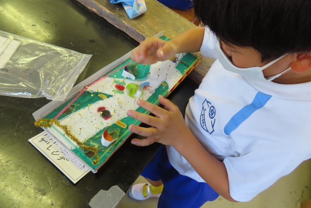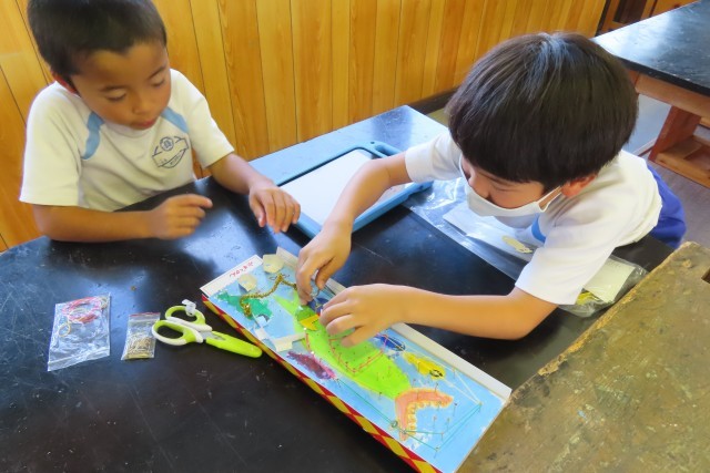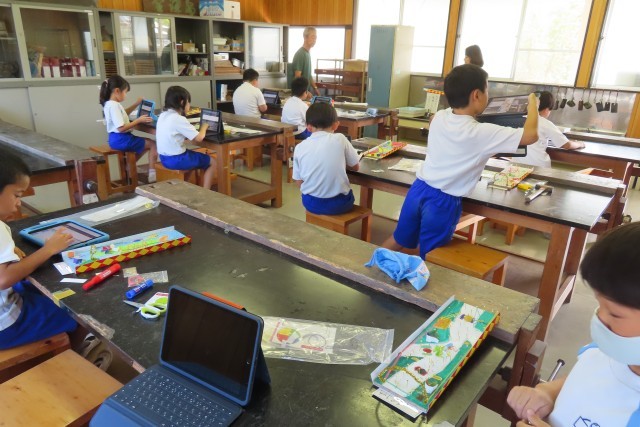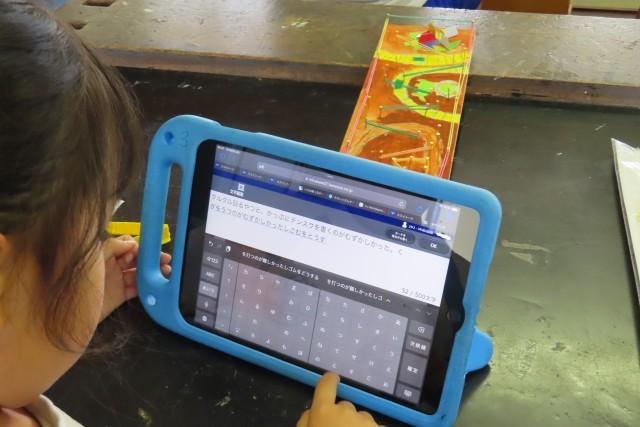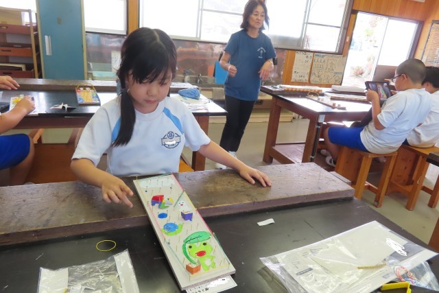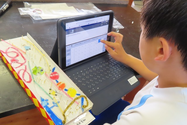 「トントン どんどん くぎうって」図工室ではちょうど、作品を完成させて、作品の写真とともに工夫したところなどをタブレット上で先生に提出しているところでした。「ここでは」スノーボードが好きな子はゲレンデを。生き物が好きな子は水族館を。難しいコースをつくりたい子は「きれいなもようの げきむずコース」など。自分の表現したいコースをつくって、くぎをうって、ビー玉を転がして遊べるものをつくりました。デザインの工夫、くぎの打ち方の工夫も頑張りました。手作りの作品で早く友達や家族と遊びたいですね。