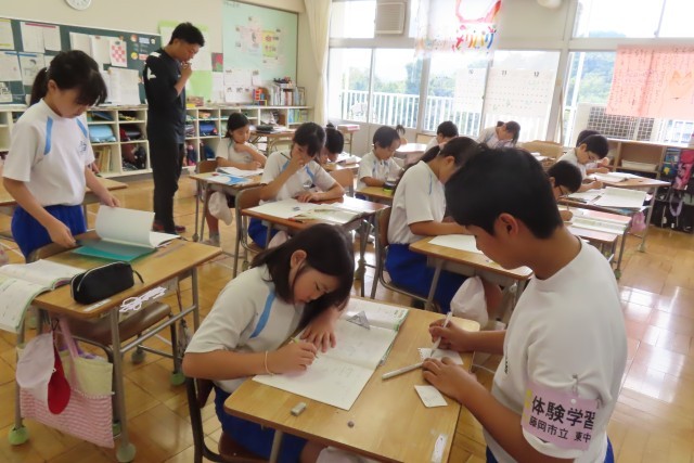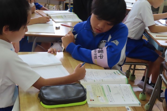 教室に入ると、ある児童がニコニコしながら「見てください!」とノートを見せてくれました。たくさんの計算に挑戦して先生から○をたくさんもらって嬉しそうでした。「できた!」「分かった!」は力をつける原動力になります。そして4年生はみんな力を付けたいからと、いつでも、どんな課題に対しても真剣に頑張っています。チャレンジウィーク中の中学生も一緒に問題を解きながらそんな4年生のやる気にこたえようとしていました。