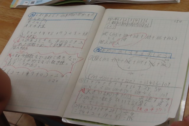 「平均」の学習中で、今日は特に算数の楽しさを味わっていたようです。平均の求め方の工夫や目的にあった平均の求め方について考えていました。考えたくなってしまう問題だったので、自分の力できちんと最後まで考えて計算したい!そのあとは、友達はどう考えたか知りたくなってしまうものです。どんどん友達のところに行ってノートを見せ合いながら交流していました。