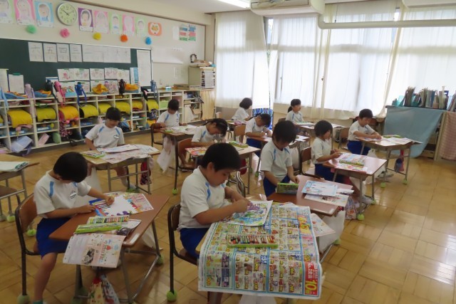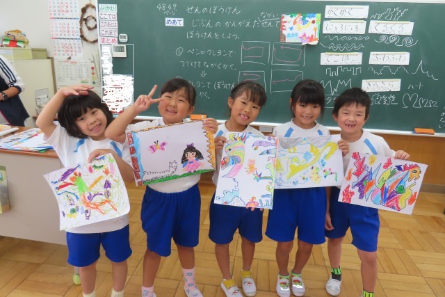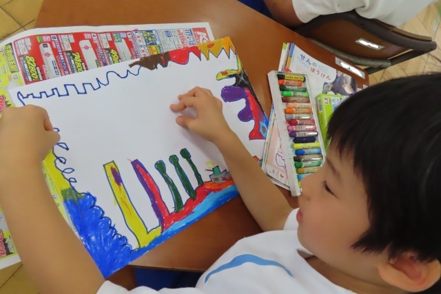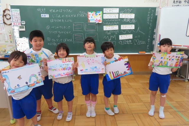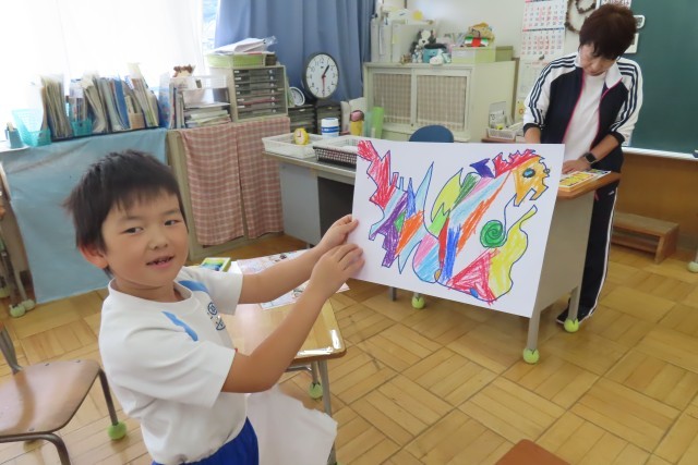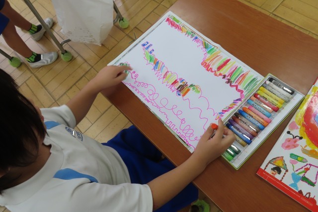 「せんの ぼうけん」とてもとても!とても!!楽しそうです。かくかく、にょろにょろ、ぐるぐる、ふわふわ等。画用紙いっぱいにいろいろな線をかいて見付けた形から、自分の「ぼうけん」の世界を想像して色をつけていきます。画用紙を上下逆さまにしても違う「ぼうけん」の世界ができたり、好きな動物に囲まれたり。昔の世界に飛び込んだり。作品を見せてもらうと、それぞれの「ぼうけん」ストーリーをたくさん話してくれました。