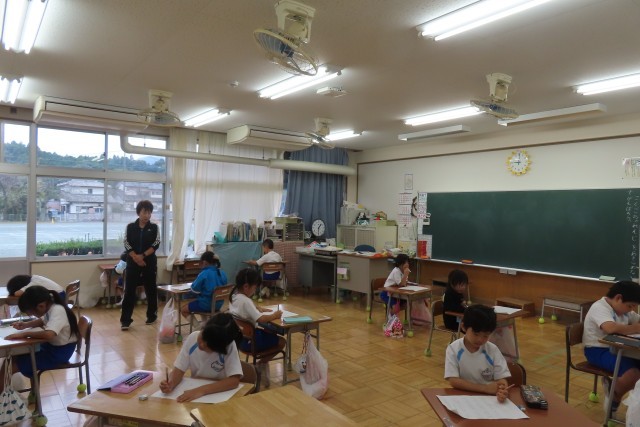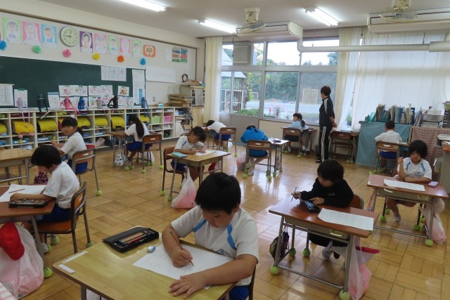 1時間目は「国語チャレンジ」。今回はならいたてのカタカナです。教室ではいったんすべて書き終わっている時間帯なのに、みんな真剣です。見直したり、心配なところを思い出そうとしていたり。本当によく頑張っていました。今日のクラスみんなの目標は「こくごチャレンジを あきらめないで がんばろう」でした。自分のやる気はもちろんですが、みんなで決めた目標のことを大事に考えて頑張ろうとするその「やる気いっぱい」がいいですね。