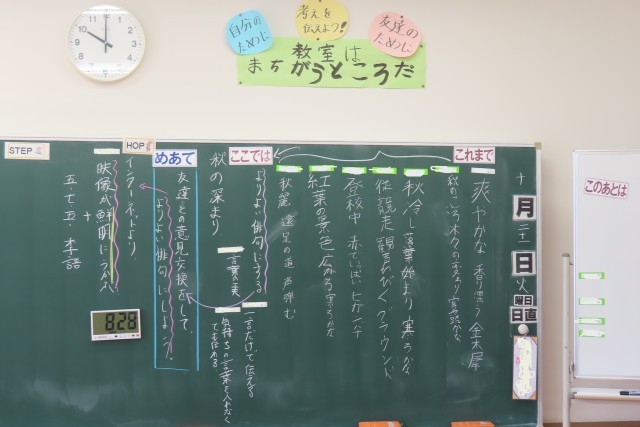 「秋の深まり」の学習中。「ここでは」今の秋(やっと感じられます)を俳句で表現します。短いことばで表す表現方法なので、伝えたい思いをどう表すかじっくり考えます。今日は、一度完成した俳句を、「さらによりよい俳句」にするためにまた考えてみます。友達の意見も参考になります。そして、大切なのは、さらによりよいって?ここが考えられたことです。俳句が表す秋の光景が鮮明に浮かんでくるようにしたい!仕上がりが楽しみです。