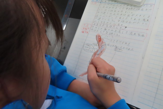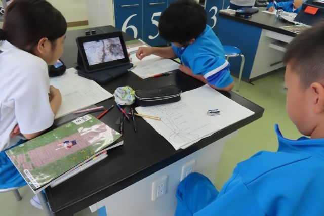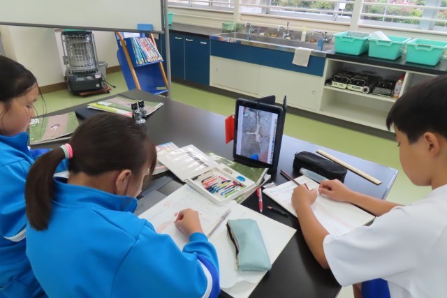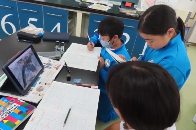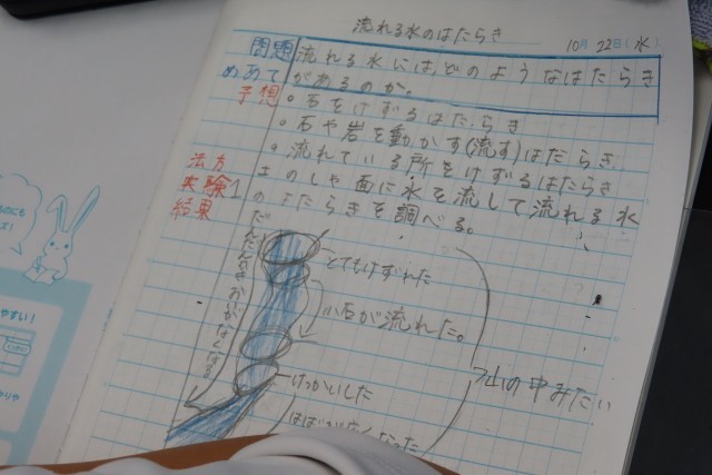「流れる水のはたらき」の学習中。今日は、校庭の土が盛られているところに川をつくり、水を流して実験しました。予想をみんなで共有してからの実験だったので、自分の予想だけではなく友達の予想ともつなげて考えながら実験していました。それを動画で撮って、実験結果をまとめます。動画を見てみると、そのときに思わず出た言葉が大切な学びにつながっていました。「うわっ!すごいな、川ってこうやってできるんだ!」とか、友達の予想とつなげて「けずられているのがわかる!」。先生に聞いてみると、実験でつくった川の形は自分たちで考えてつくったそうです。実験の仕方、学び方もしっかり考えることができる5年生。