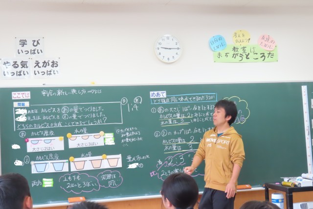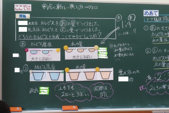 児童に大人気の飲み物「カ○○ス」をつくった2人の先生がいます。どちらのほうが甘いか?水の量と原液の量から考えました。教科書はドレッシングですが、こちらの問題の方がおもしろそうで、「やる気いっぱい」な新しい単元の学習のスタートでした。「ここでは」比の考え方を知り、その考え方を活用して様々な場面(生活場面)での課題を解決できるようになります。「カ○○ス」の作り方の説明には「1:4」と書いてありました。さて、先生たちのは適量だったのか?それも考えていました。