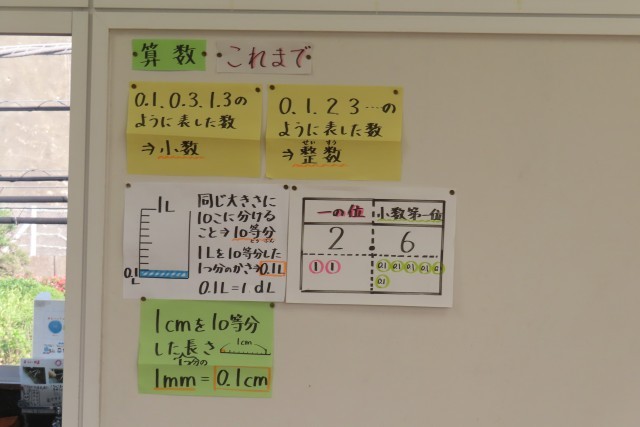 「小数の計算」ができるようになっています。今日はたしざんです。「0.5+0.3」の答えをどう求めるのか?考えました。図をかいたり、絵をかいたり、整数と同じようにして考えたり、文章にして表現したり。みんなそれぞれ考え方が違いますが、それぞれの考えを発表している間に、大事なことに気付きました。「0.1のいくつぶん」みんながしっかり理解することができました。