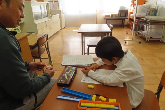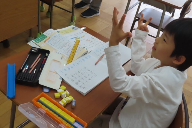 1年生は「たしざん」で答えが10になる計算ができるようになりました。どんどんできたので、授業の後半には、3つの数のたしざんもできるようになっていました。丁寧に考えていることが「できた!」につながっています。先生にたくさんほめてもらって、○もたくさんつけてもらいました!