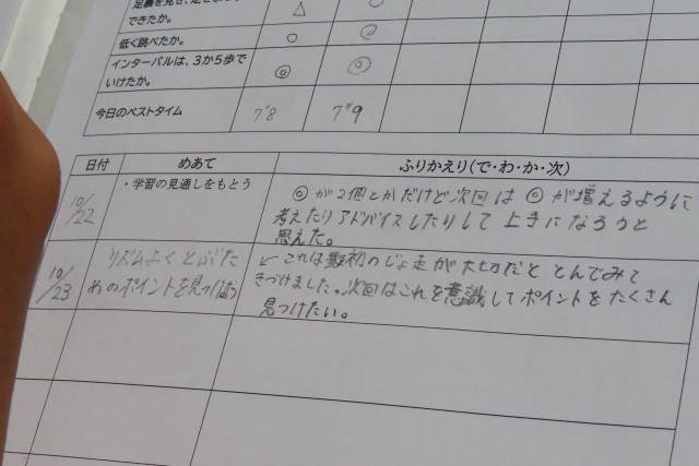 ハードル走を頑張りました。前回よりも今回のほうが速くスムーズに。そのためにどうしたらいいか?しっかりと自分で考えます。うまくいくには理由がある、その逆も同じです。そこをしっかり考えることができる児童です。そして、今日の自分の学習をふり返りながら、次は!と目標を強くしていると思います。