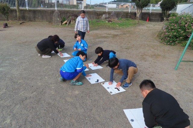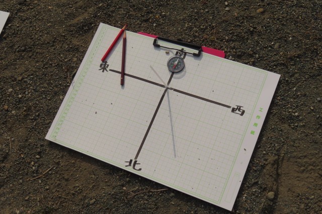 「太陽とかげ」大好きな影踏みの遊びから始まった「ここでは」ひなたとひかげの様子を継続的に観察し、ひかげの位置と太陽の位置の変化、地面の様子などについて実験を通して学びます。今日は、太陽の位置と影の向きを調べるために、ちょっと厚い(風で飛ばされない)画用紙、方位磁針や遮光プレートをもって(正しく使って)校庭で実験を始めました。継続して観察が必要なため、実験結果の記録される画用紙は、しばらくは校庭に置いたままにします。