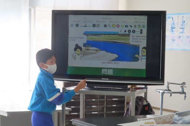 「流れる水のはたらき」の学習です。今日は、平地を流れる大井川の資料を見て、流れる水の働きが大きくなるのはどんなときなのか?予想をたてて、実験の方法を考えました。いろいろな予想が出ましたが、とても感心したのは、前回の実験(校庭の土の山に川をつくって水を流した)のときの様子とつなげて考えをもって説明した児童です(写真中)。友達から拍手がおこりました。この予想の共有から、実験方法を考えることができました。もちろん、「変える条件」と「変えない条件」を具体的にイメージしています。次時の実験が楽しみです。
