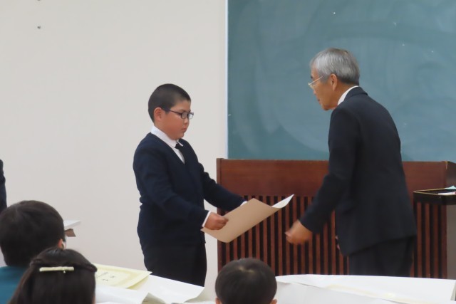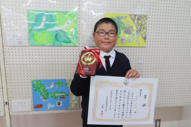この日、地域づくりセンター藤岡にて「高山社とカイコをめぐる絵」の表彰式がありました。本校から4年生児童「優秀賞」、3年生児童「優良賞」を授与していただきました。この表彰式には市長さん、教育長さんのご臨席のもと、たくさんの方々からお祝いしていただき、とても嬉しそうでした。作品はとても素晴らしく、講評の中でたくさんほめていただきました。近々学校でも表彰式をします。ほんとうに、おめでとうございました!