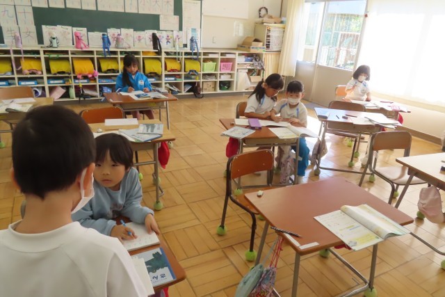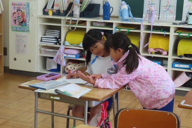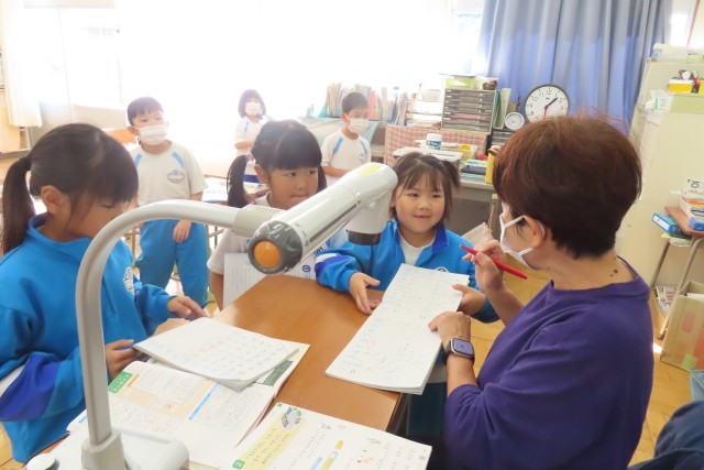 教室に入ると、「せんせい!」できました!」の声がたくさん聞こえてきました。「たしざん」の学習です。「ここでは」答えが10を超えるたし算の計算ができるようになります。前時はブロックやおはじきを使って考えましたが、今日は式を書いて、片方の数字で10をつくって考えます。「これまで」学習した「10のたしざんのうた」が頭の中で大活躍です!できた!先生に○をつけてもらった!ほめてもらった!が「やる気いっぱい」の原動力のようです。