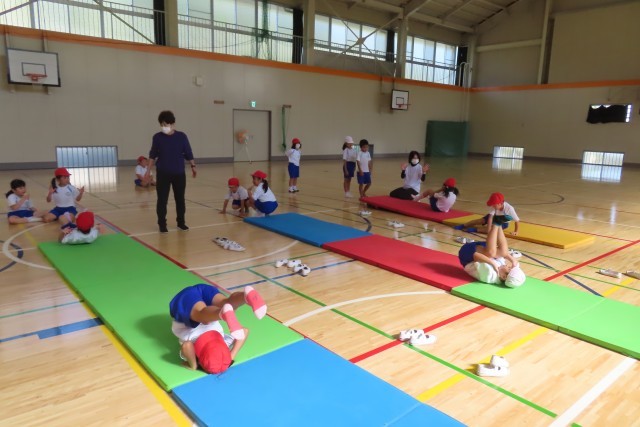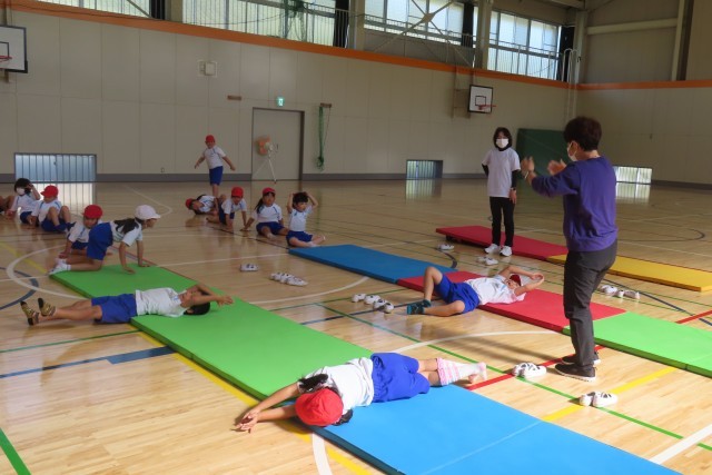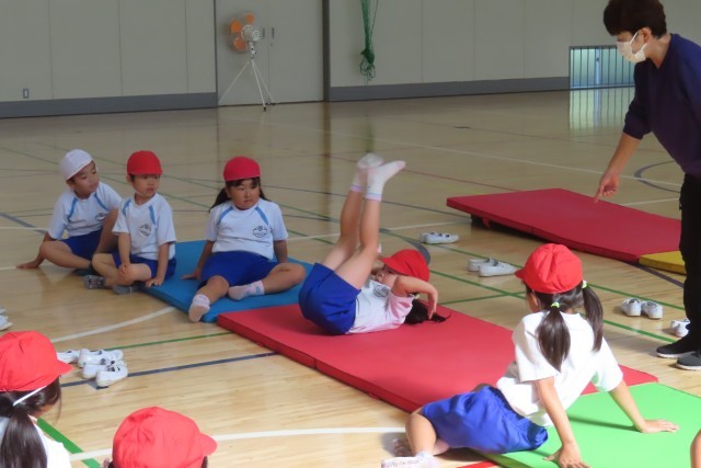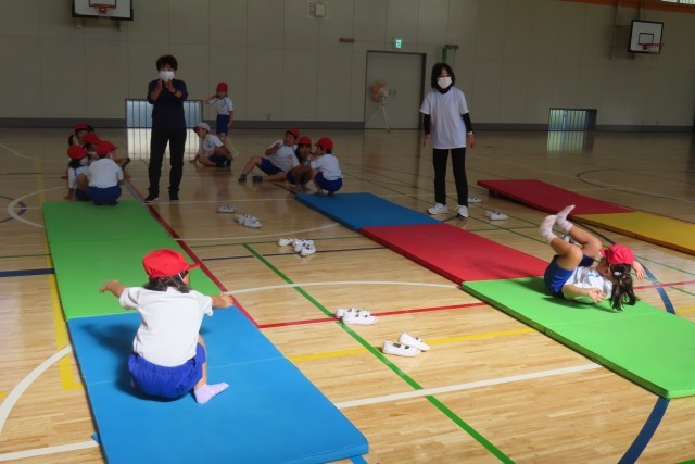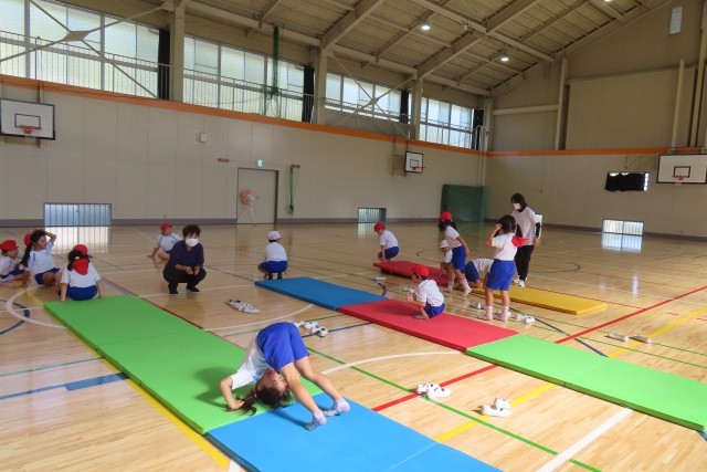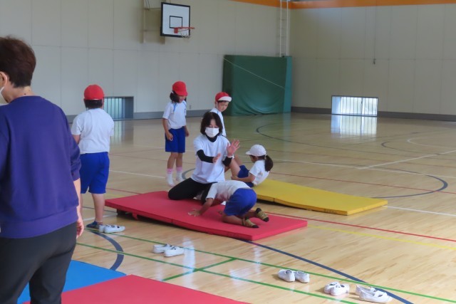 マット運動。今日は、後転が先週よりも上達しました。それはなぜかというと。うまくできるコツをつかんだからです。また、先生の話をよく聴いて、授業のはじまりにやっている様々なマット遊びで意識した大切なポイントを生かしてやろうと努力したからです。もう一つ。上手にできた友達の演技(写真上)をよく見て、「じぶんも できるようになりたい!」と、まねしようとしたからです。