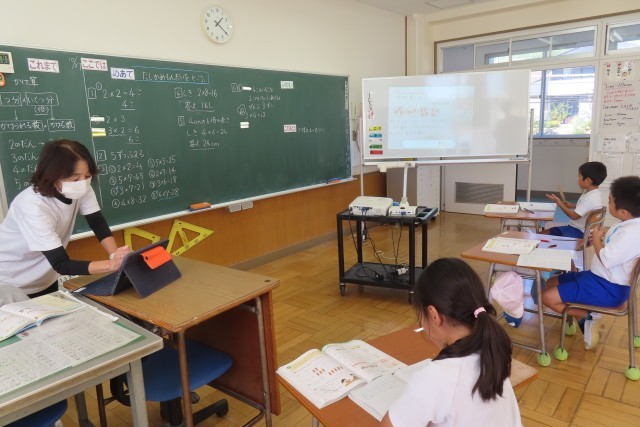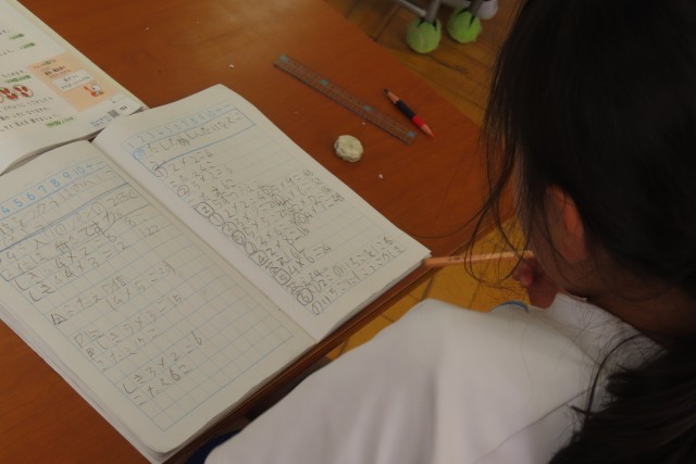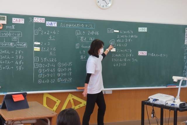 「かけ算」のたしかめ問題に挑戦しました。ちょうど教室では、発展問題を。どんな問題かというと、4皿のイチゴの数をかけ算を使って求めますが、お皿の上のイチゴの数はそれぞれ違っているので、どうすればよいか?イチゴを動かしてかけ算で求めます。どう動かすか?はみんな一緒ではなく、それに伴って、3×4なのか4×2なのか、式も異なってきます。でもそれをしっかり理解できていたこと、友達の動かし方を知って「なるほど!そういう動かし方もあったか!」と学んだことは、とてもよかったです。感心しました。