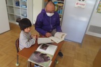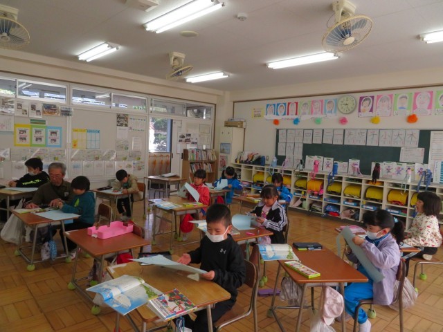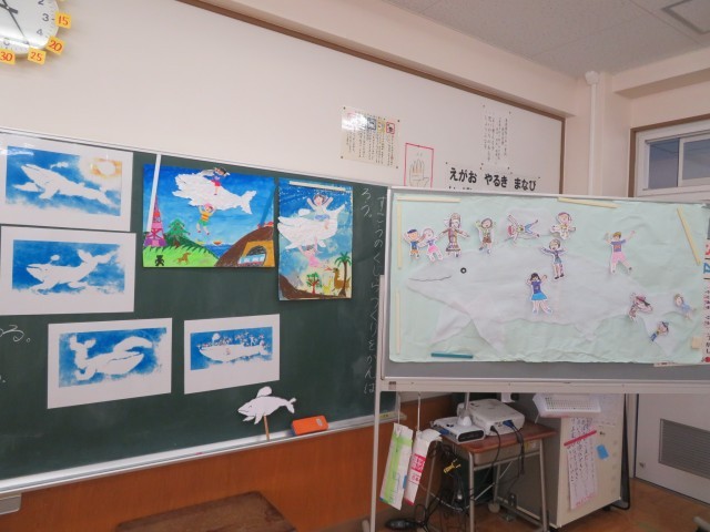 国語で読んだ「くじらぐも」児童にとっては大好きなお話です。これを絵で表現し始めました。「絵をかく会」のテーマとなります。国語の学習の中でみんなで大きなくじらぐもにのって青い空を楽しんだときのことを思い出したり、先生がつくった作品を見たりして、自分のつくりだしたい画用紙の上の世界を考えます。今日は、くじらを描いて切り抜いていました。大好きなお話を大好きな絵におもいっきり表現してくださいね。