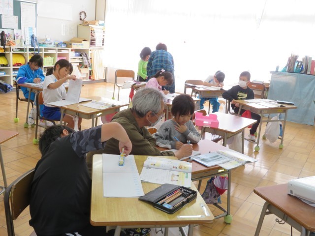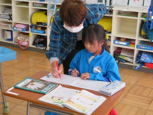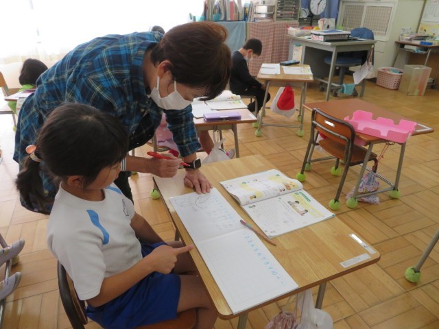 「たしざん」今日は「7+6」の計算の仕方を考えました。「これまで」学習した「10のうた」を頭の中で歌いながら、「どっちを10にしようかな?」と考えます。とてもよくできていて、先生から新しい問題を出してもらいました。さくらんぼ算の図を書かなくても答えが出せた児童には先生が「どうやってかんがえたの?」と聞いていました。バッチリ解答できて、先生からほめられた子は「さんすう だいすき!」と嬉しそうでした。
