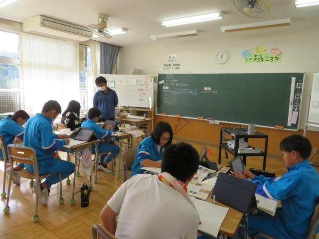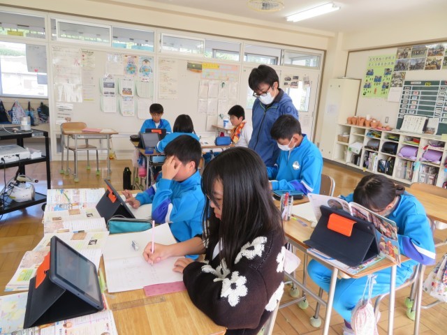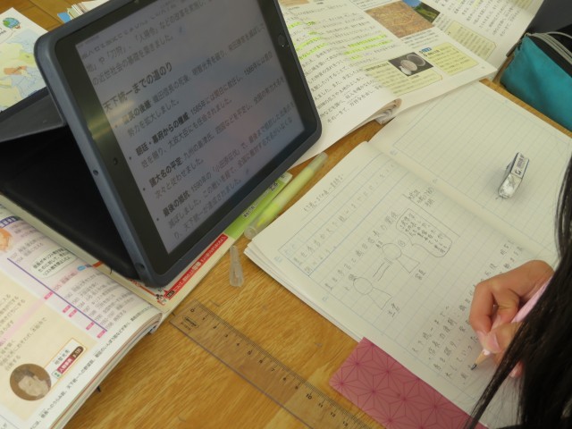 「戦国の世から天下統一へ」の学習中。今日は、豊臣秀吉が天下統一を進めるために行ったことを調べ学習していました。先生が示してくれた動画資料を見たり、資料集やインターネット等を活用して、必要な情報をノートにまとめます。いろいろなまとめ方が見られました。ただ写すのではなく、自分なりのまとめ方で表現しながら、歴史上の事実について自分なりにきちんと整理して理解しているのがよく伝わります。次時の発表が楽しみです。