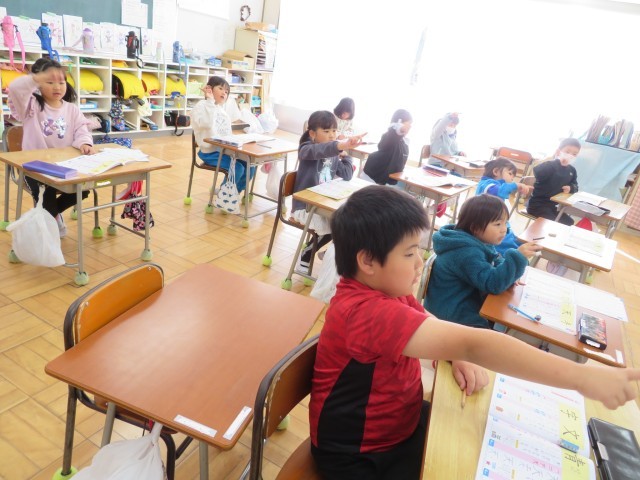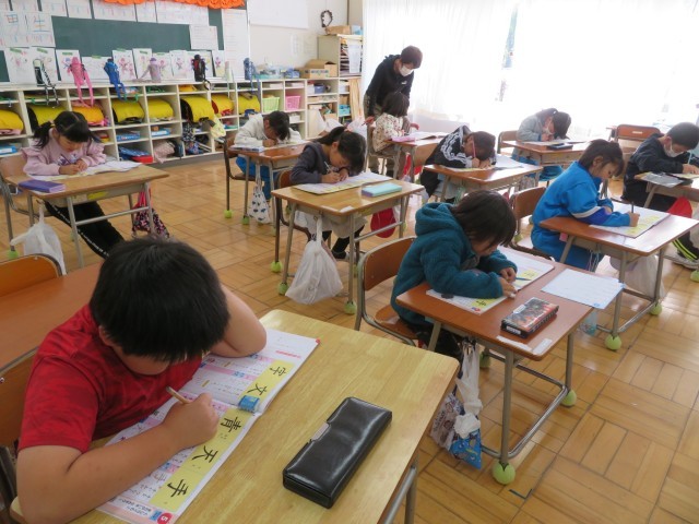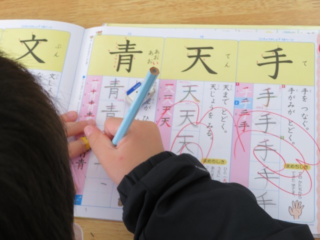 漢字がどんどん書けるようになっている1年生です。今日は「手」「天」「青」を書けるようになりました。「むずかしいなあ」書いては消し、書いては消ししていますが、それが大切な学習ですね。先生に書き方を教えてもらって、ゆび書き、なぞり書き、うつし書き。段々と上手に書けるようになっています。また、特に漢字を書くときの姿勢はとてもよいです!