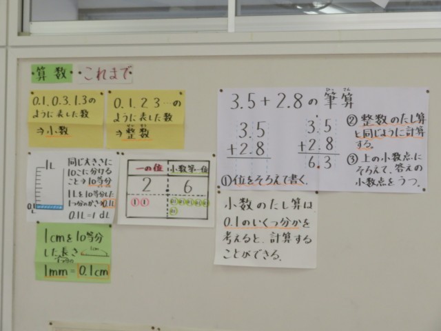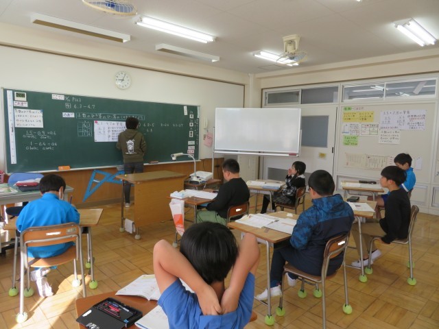 「小数の計算」今日はひき算ができるようになりました。自分の力で解きますが、途中でミニ先生、友達同士の教え合いが見られました。友達に分かりやすく教えることができるのは、理解できている証拠です。そして友達に教えてもらうと、よく聴いてさらに「やる気いっぱい」になれるものです。そして「ここでは」いつでも「0.1のいくつぶん?」「位をそろえて」大切なポイントはこのあともずっと大切です。