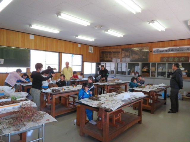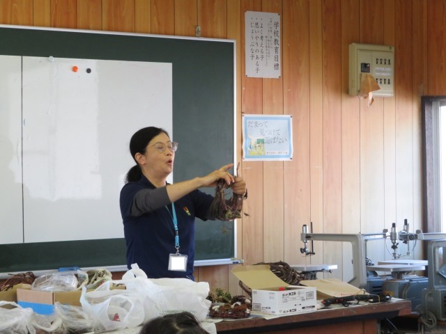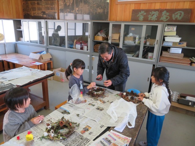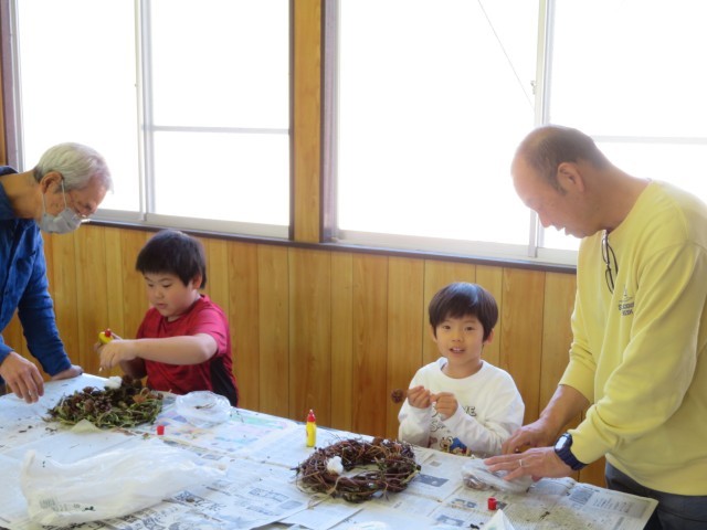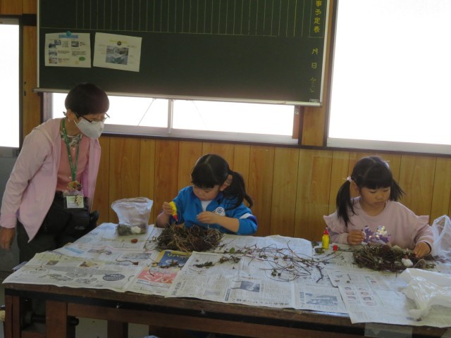 この「フォレストリースクール」は、群馬県が森林や環境に関する学習支援として実施しているプログラムです。今日は「群馬県緑のインタープリター」の方々に講師としてご来校いただき、1年生にリース作りを教えていただきました。材料は、1年生が入学してからずっと大切に育ててきたアサガオのつる、2年生からもらったサツマイモのつる、また、松ぼっくりやどんぐり等の秋の自然からのプレゼントです。1年生らしいとても元気いっぱいな作品が仕上がりました。