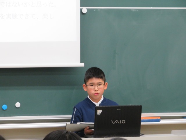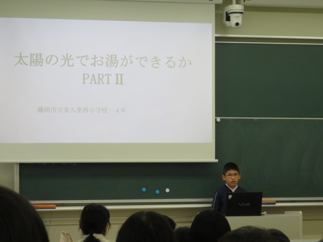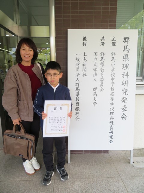 この日、群馬大学荒牧キャンパスにて標記発表会が開催されました。4年生児童が堂々と素晴らしい発表をしました。テーマは「太陽の光でお湯ができるかPARTⅡ」です。昨年度の研究「PARTⅠ」から生まれた新たな疑問の研究に取り組み、大変分かりやすく興味深い内容でした。講評の中で、継続研究であることが素晴らしい!、実験内容が生活経験や理科の授業での学びと結びつき、そのアイデアがすごい!さらには災害時の行動への提案が含まれ、新技術の開発にもつながるものであるとお話をいただきました。日常生活において調べてみたい!を実行に移して素晴らしい研究発表につながったことはもちろんですが、この発表本番に至るまでかなりの努力をし、当日100点満点の仕上がりだったことも大きな拍手をおくります。