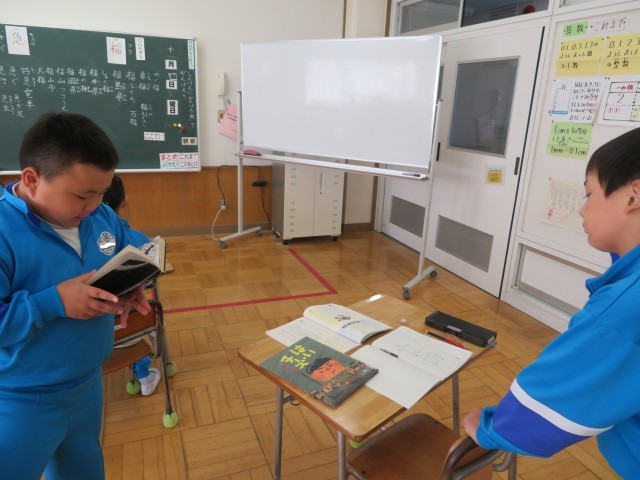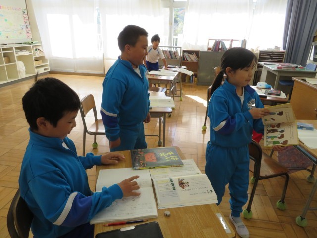 「おすすめの一さつを決めよう」の学習に入りました。「ここでは」1年生の本好きがさらに増すように、紹介したい本を決めるための話合いを通して、目的と決めることをはっきりさせ、役割や進め方を決めて進行にそった話合いが上手にできるようになります。まずは自分の考えをもつために、自分が1年生に紹介したい本とその理由をノートに書き出していました。3年生は本が大好きです!紹介したい本について友達とその本のよいところを嬉しそうに話していました。本が好きで本のことを話題にして楽しい時間が過ごせるなんて、すてきです!