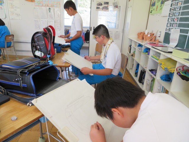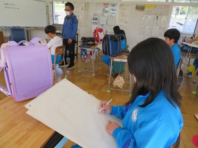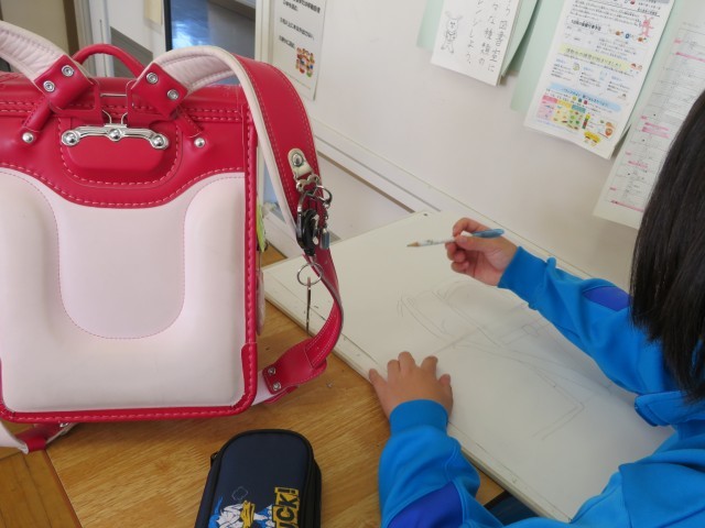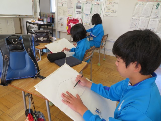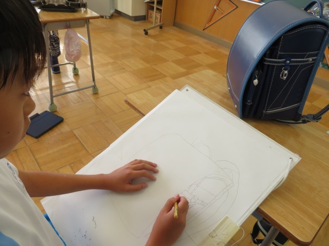 「校内絵をかく会」です。6年間一緒に登校したランドセルに自分の思いを吹き込んで表現します。今日はその下書きの練習です。ランドセルは自分が一番表現したい置き方で、自分が一番表現したい角度からじっくり見て描きます。いつも家に帰るとこんな置き方していたなあ、「班長」の印も大切な思い出だなあなどなど。一人一人の思いのこもったランドセルの絵をお楽しみに!