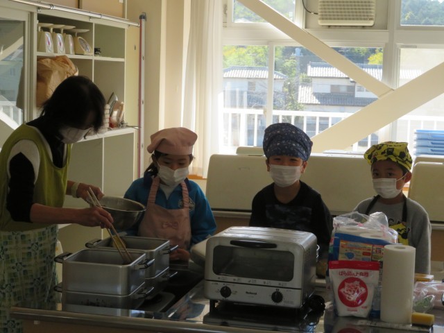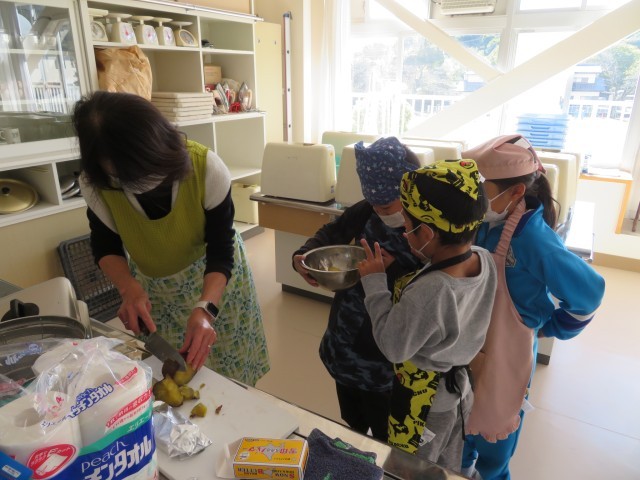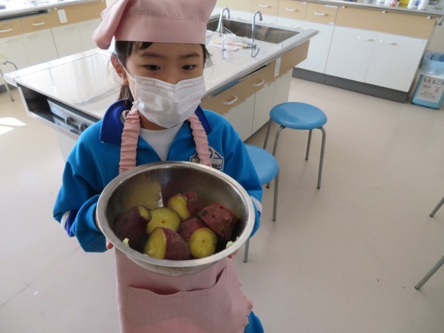 2年生は先日収穫したさつまいもを使って、「さつまいもパーティー」を開きました。1年生を誘ってスイートポテトを作りました。2時間目はその準備。先生に教えてもらいながらアツイ、アツイ!おいもをふかして準備しました。