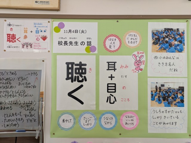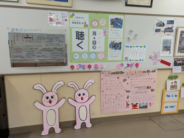 西うさぴょんと教務主任の先生が、児童のお気に入りの掲示板をリニューアルしてくれました。昨日の朝礼で、みんなで考えた「聴く」の大切さを伝えてくれています。