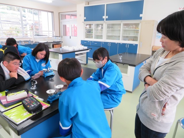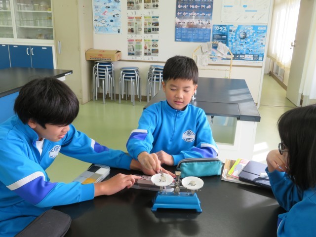 「てこのはたらきとしくみ」の学習中です。ちょうど理科室では、上皿てんびんを使っていろいろな物の重さをはかっていました。「ここでは」学んできた「てこ」の働きがどう生かされているのか?その仕組みについて考えることができたでしょうか。さらに様々な場面で、「ここでは」の学びが生かされるとよいですね。また、分銅の使い方もしっかり正しく理解して実験することができていました。