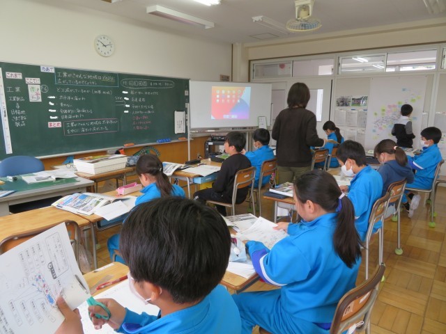 「くらしを支える工業生産」今日は工業が盛んな地域の分布と特色について考えました。教科書や資料集などの様々な資料を参考に考えますが、一番参考になったのは、みんなで協力して調べ上げたマップだったのではないでしょうか。「たしかに!」そして、この調べ学習をしたときに「もっと調べたいなあ」と思った気持ちがさらによみがえってきたのではないでしょうか。