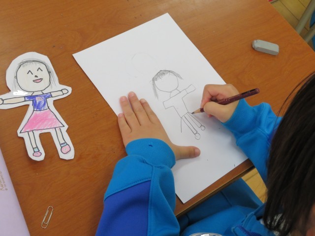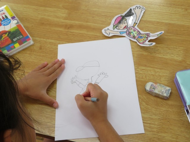 「校内絵をかく会」では大好きな「くじらぐも」と自分を表現します。国語の時間にはみんなで同じ「くじらぐも」にのって青い空を楽しみましたが、今度は自分だけの「くじらぐも」です。今日は、「くじらぐも」をつくったあと、自分の絵を描き始めました。どんな自分のお話をつくったのかな?どんな気持ちでいたいかな?想像をふくらませて、一生懸命描いていました。