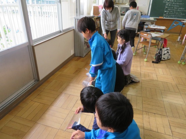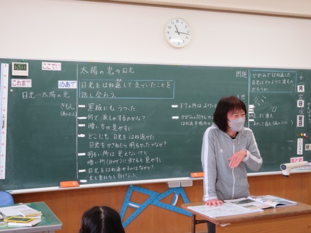 「太陽の光」の学習に入りました。今日は雲の多い天気ですが、教室に入るわずかな太陽の光を見付けて、鏡を使って日光をはね返す実験をしてみました。そこからどんどんいろいろな疑問(知りたいな!)が生まれてきます。鏡以外でもはね返すのかな?やってみよう!透明な下敷きなどを持ってきて試してみました。するとますます「やる気いっぱい」になってきて、次の時間の実験(鏡ではね返した光の進み方)が楽しみになりました。お天気に恵まれ実験日和になりますように!