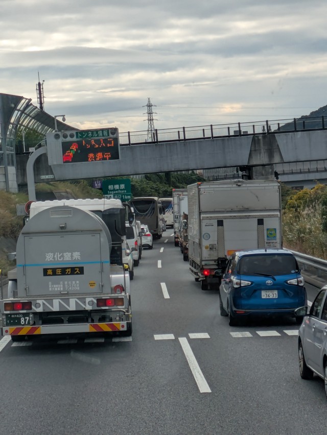 ただいま予定より遅れて厚木PAを出ました。高速上はかなりの渋滞です。厚木PAでのトイレ休憩はかなりの混み具合で、なんとトイレ前行列30分待ち(女子)です。このあと順調に進むことを願いますが、とにかく安全第一で進んでいきます。