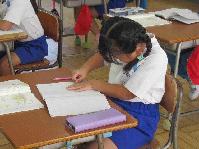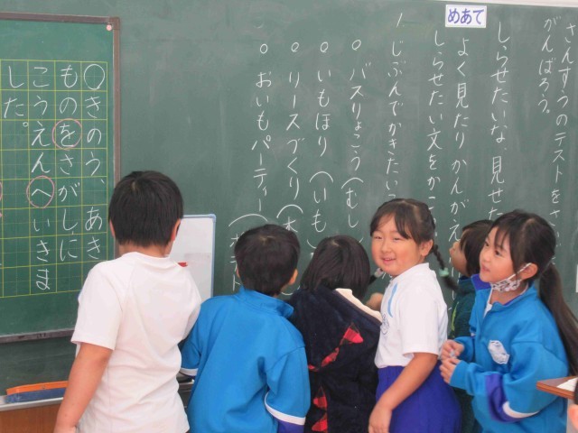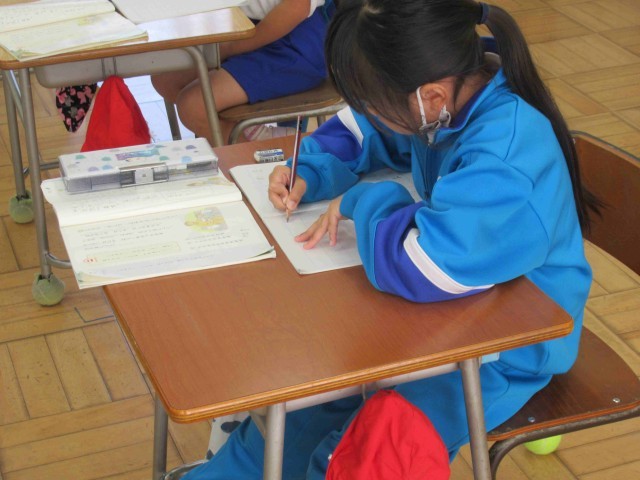 1年生の国語は「しらせたいな 見せたいな」。知らせたいことを考えて、文を書いていきます。バス旅行やいもほり、リースづくりなど、最近の出来事の中から自分が知らせたいことを選びました。知らせたいことが決まると、子供たちは「はやく書きたい!」とやる気満々。たくさん知らせたいことがあるのでしょうね。すぐに集中して書き始めていました。