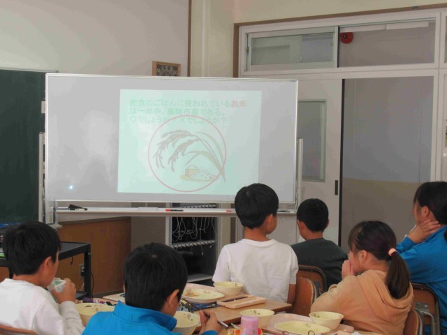5年生では給食の時間、藤岡市給食センターの栄養士さんから、食に関するお話をしていただきました。テーマは「地産地消」。地産地消は安全・安心であることや、地域の活性化にもつながることなどを説明していただきました。藤岡市では、市内の高校生が生産している野菜なども食材として使われているとのことです。現在、「時間内に残さず、減らさず」を合い言葉に「給食チャレンジ」に取り組んでいる5年生。このチャレンジへの意欲をさらに高めていけるお話をいただくことができました。