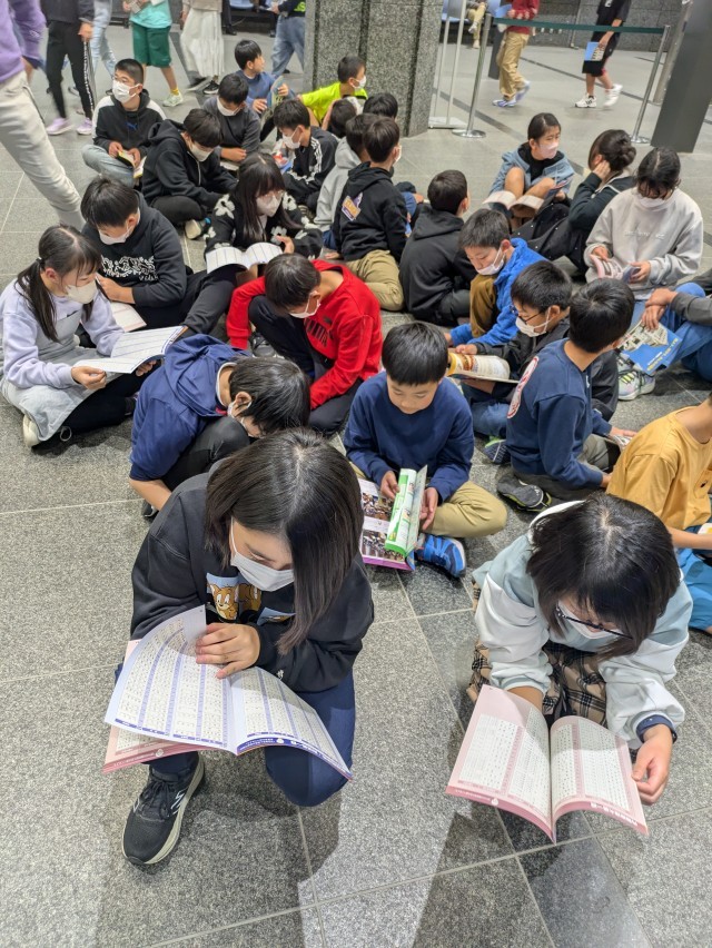 綺麗なイチョウ並木をみながら到着しました。これから見学が始まります!始まるまでいただいたパンフを真剣に見ています。