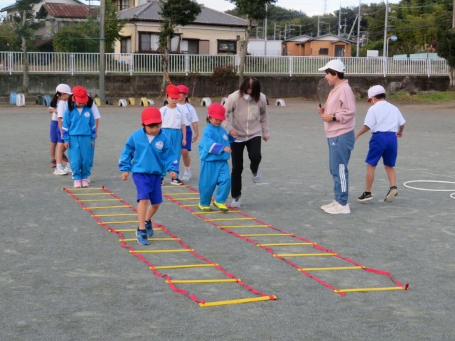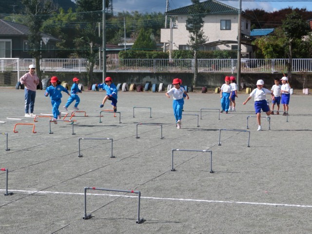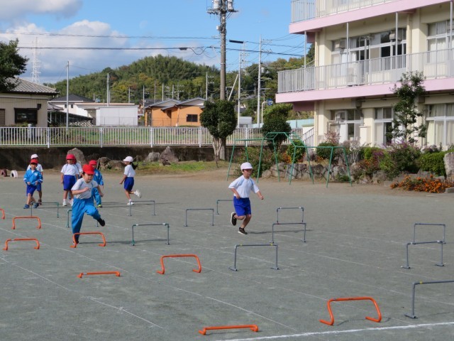ハードルあそび。初めてやったときよりも、スピードアップ、リズムよくとびこえることができるようになっています。最初はラダーやケンケンパで慣らしたあと、ミニハードルをつかって何本もとびこえます。自分で1、2、3とかけ声を意識してとんでいたり、先生からのアドバイスをよく聴いて生かしていたりと、速くリズムよくとんで走るれるようになりたい!と「やる気いっぱい」です。