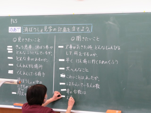 「わたしたちの安全なくらしを守る」今日は26日の消防署見学の計画をたてはじめました。消防署の方々に質問したいこと、見てきたいことをみんなで出し合っているところでした。知りたいこといっぱいです。テレビなどで消防署の方々の働く姿を見たことがあるけれど、実際に自分の目で見た児童はほとんどいないと思います。教科書や資料集で学んだことを実際に自分の目で見てきて、聴いてきて、さらに深く広く「安全なくらし」について考えるきっかけとなることと思います。