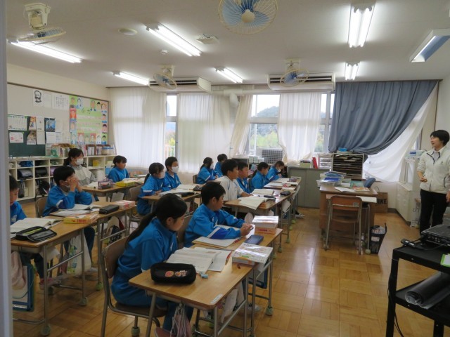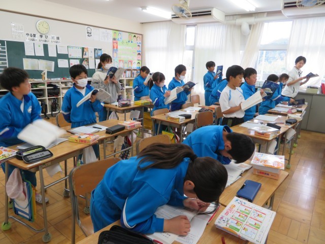 「浦島太郎」のお話を古典の文章で読んでいました。教室に入ったときは、児童が声に出して読んでいるところでした。声に出して読んでみると、言葉のひびきやリズムなど、現代文とは違う感じがしたのではないでしょうか。また、すでに知っているお話だと思って読んでいると、ちょっと違うなとか、こういうことと関係があるのかな、とか気付いたことがあったようです。古典文学に関心をもつよい機会となったことでしょう。