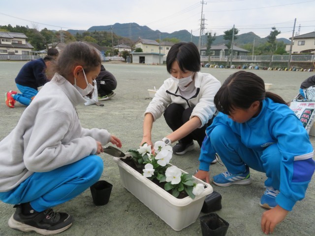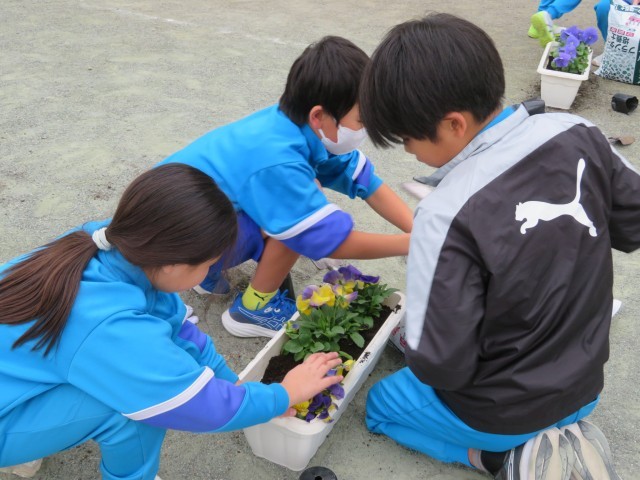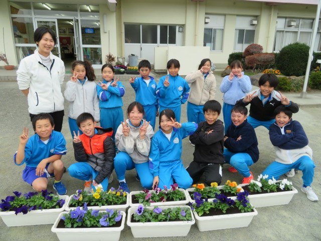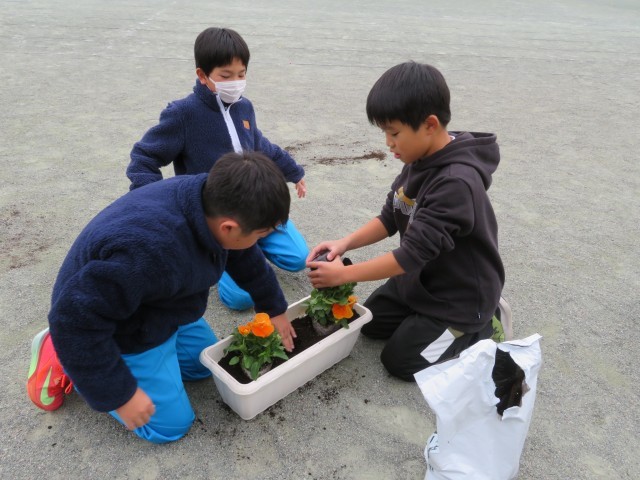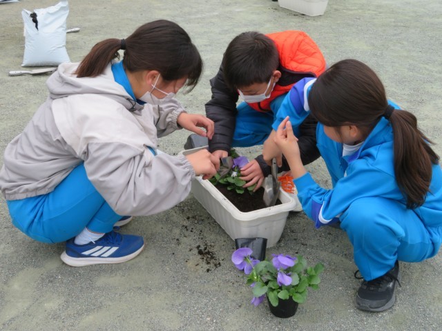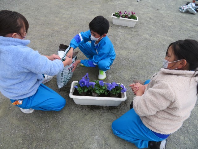 6時間目には5年生がパンジーの苗を植え、これから育て始めます。担任の先生の指示がなくてもどんどん動ける5年生に感心しました。先生も褒めていました。作業が丁寧だし、速いです。来年の春(お別れと出会いの季節)に向けて、これから大切に・・・大切に育てていきます。