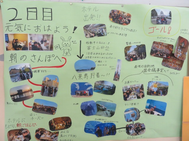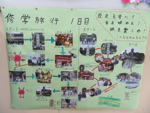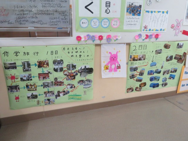 6年生が先週の修学旅行の思い出を模造紙にまとめて掲示しました。1~5年生の児童は、この6年生からのお土産をよく見ていました。「いいな、はやくいきたいな!」と1年生。「5ねんご たのしみだね!」保護者の皆様、地域の皆様、ご来校の際には是非、お楽しみください。